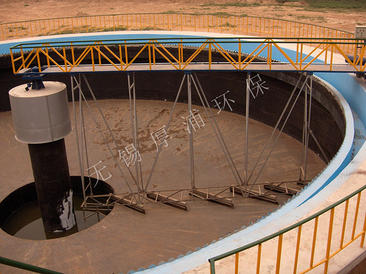 原水从池底经(jīng)中心支墩上不流出,并经稳流筒配水后,呈辐射状流向池子周边集水槽出水,随着辐向(xiàng)流速的降低,原水中的悬浮物被分(fèn)离而沉降于池底。工作桥以中心支座为圆心,带动刮泥、排渣机构,在驱动装(zhuāng)置(zhì)驱动(dòng)下将污泥刮集至沉淀池中心集泥槽,依靠水压或泵排出(chū)池外(wài),上部浮渣由刮渣板(bǎn)同步刮至排渣斗排出(chū)。