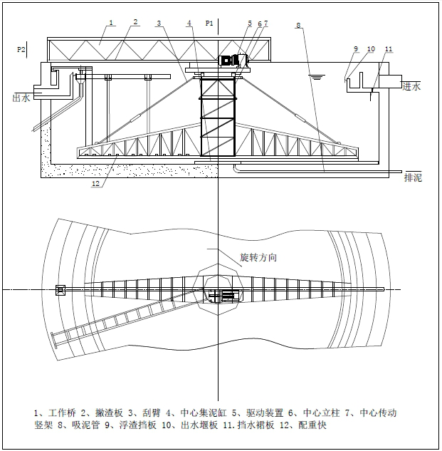 该设(shè)备采用中(zhōng)心传动、垂架式,污水进入周边配水(shuǐ)槽内(nèi),经(jīng)槽底配水孔均匀流入池内,并在周(zhōu)边挡水裙板的作用下,水流从池底流向中心,污泥(ní)依靠自重沉积于(yú)池底,从而形成泥水分离,驱(qū)动装置驱动(dòng)中心竖架旋转,并带动刮臂及吸泥管旋转,在静水压力的作用下,污泥均匀地进入(rù)吸管上布置的吸(xī)口,然后通过中心排泥井(jǐng)的套筒阀排出池外(wài)。排(pái)泥(ní)量的大小可(kě)由套(tào)筒阀的升(shēng)降度来控制,水面的浮渣通过撇清装置撇向池边,再由刮渣耙刮进(jìn)排渣斗内排(pái)出池外。